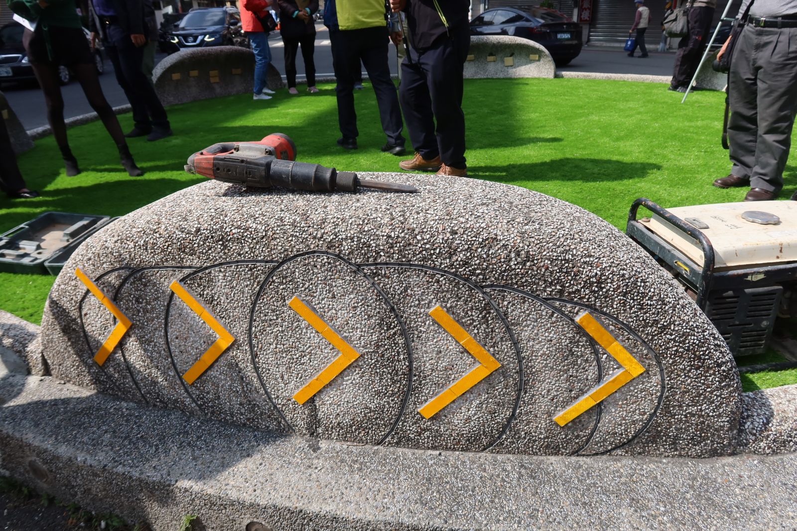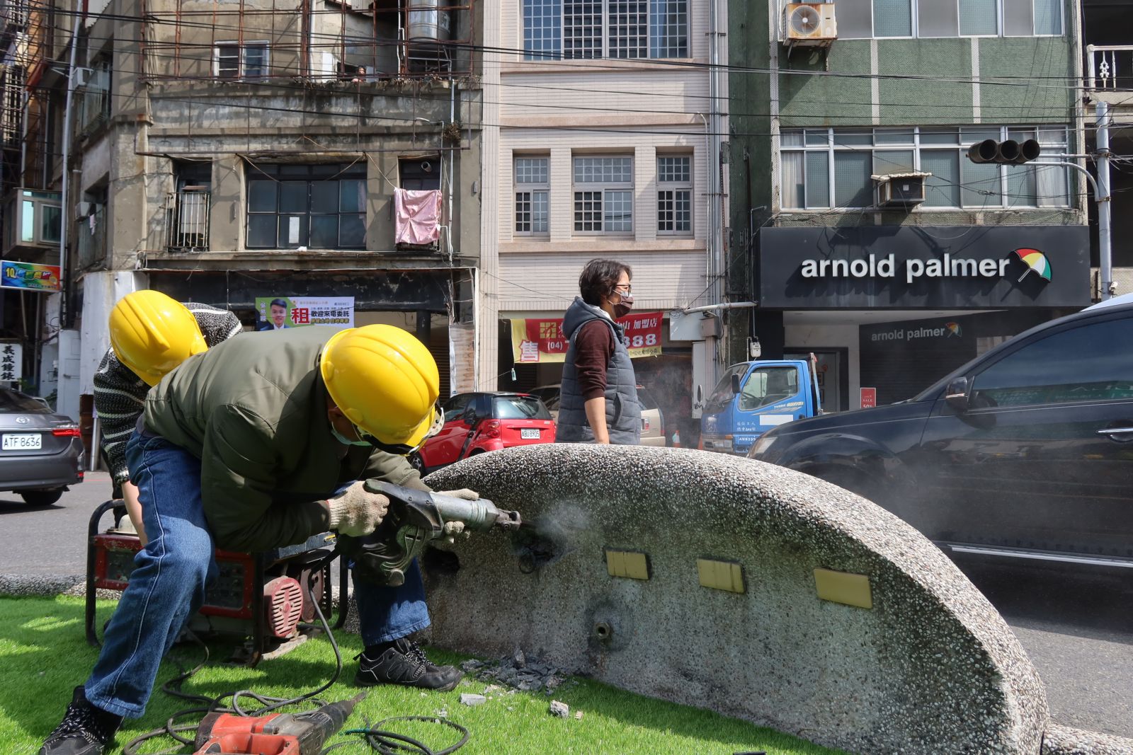 彰化市公所今天雇工先象徵性用電鑽破壞水泥石台,公所表示,拆除的管線都先保留以備之後所需時可以使用,打掉要花一段時間,預計今天傍晚可完成。不過,因三角公園夜間照明不足,原本的石台上有反光指示,拆掉後顧及用用路人安全,公所仍規劃設置架高的LED指示行駛方向,避免發生交通事故。