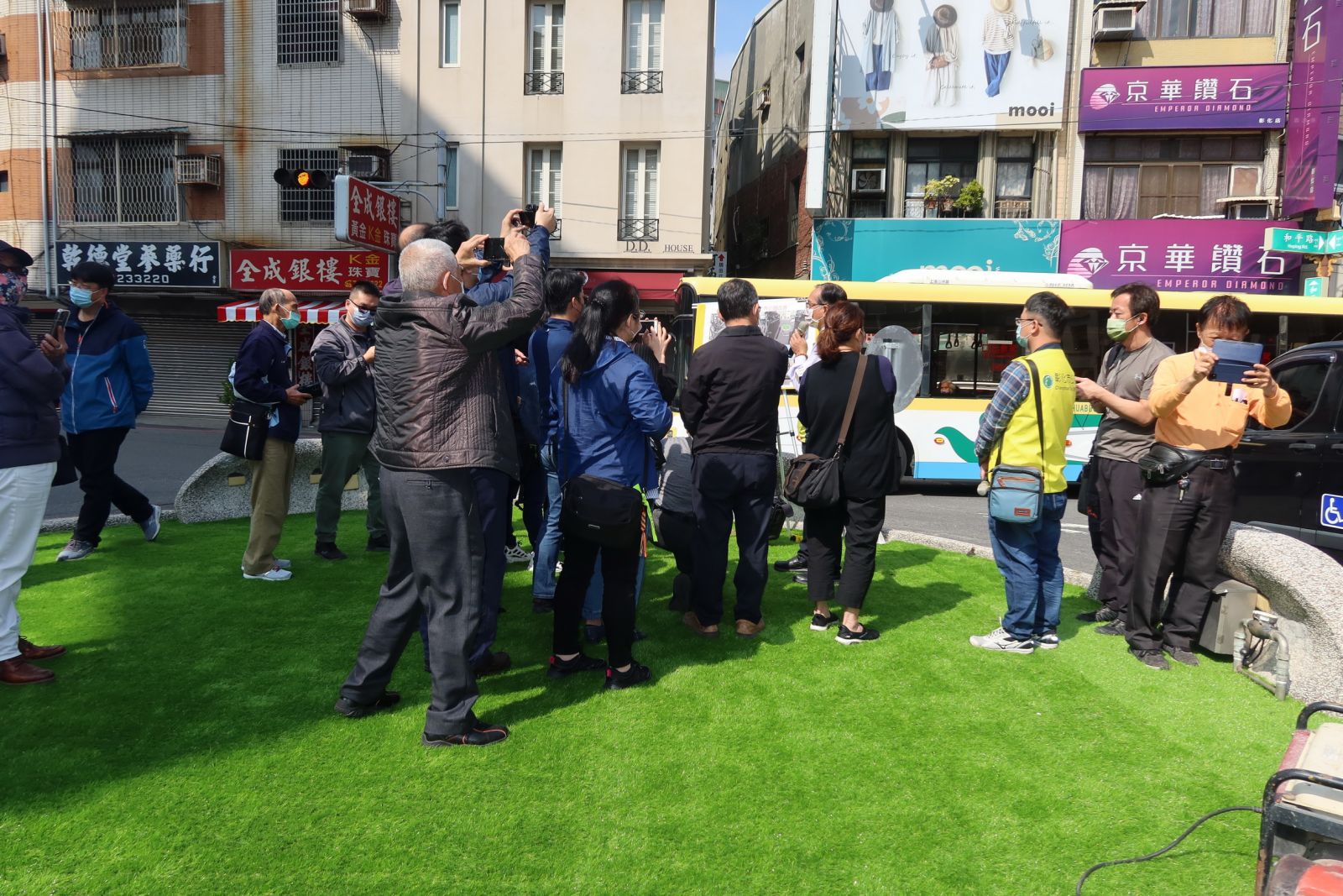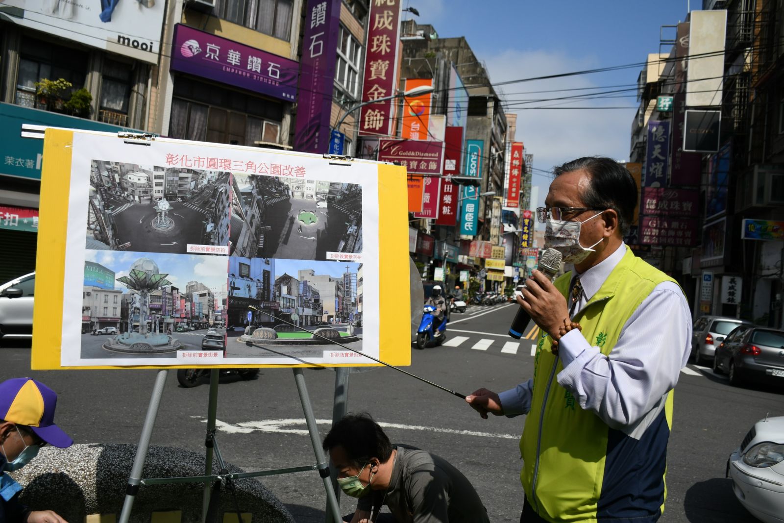 ▲彰化市長林世賢到場查看三角圓環現況,他強調,蓮花座拆除後,留下原有石墩,這樣的景觀是否像墓地,見仁見智。