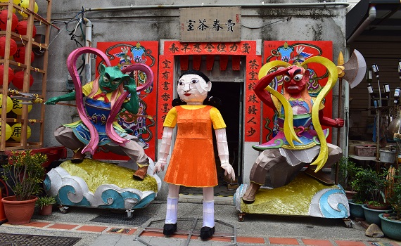 花燈大師顏三泰說,這次總共有做四座花燈來巷弄燈會,這個是目前最流行的魷魚遊戲,123木頭人,配合流行。歡迎來北港走春、看花燈。