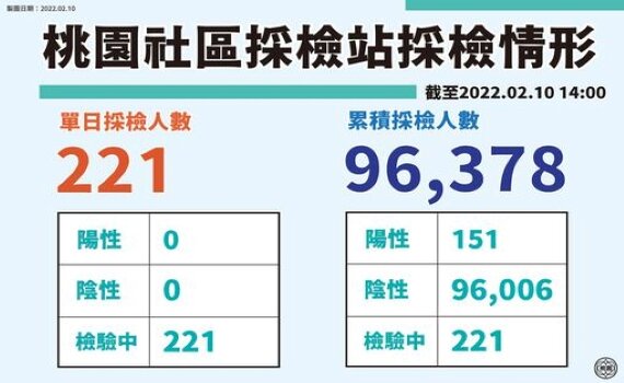 鄭文燦指出,今日桃園社區採檢站單日採檢221人,累計採檢9萬6,378人,全市10日至12日仍維持開設桃園火車站後站停車場、龍岡採檢站、仁愛市民活動中心、大溪區綜合運動公園、八德區綜合大樓、新勢市民活動中心等6處社區臨時採檢站,另有桃園區中路公園及中壢區中正公園2處,供居家隔離與居家檢疫者專用的固定採檢站,持續監測社區安全。