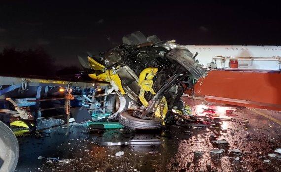 ▲台61線西濱快速道路彰化北上路段,在暗夜發生油罐車和大型拖板車追撞的重大事故,油罐車翻覆後橫躺在南北雙向車道,造成司機身受重傷。