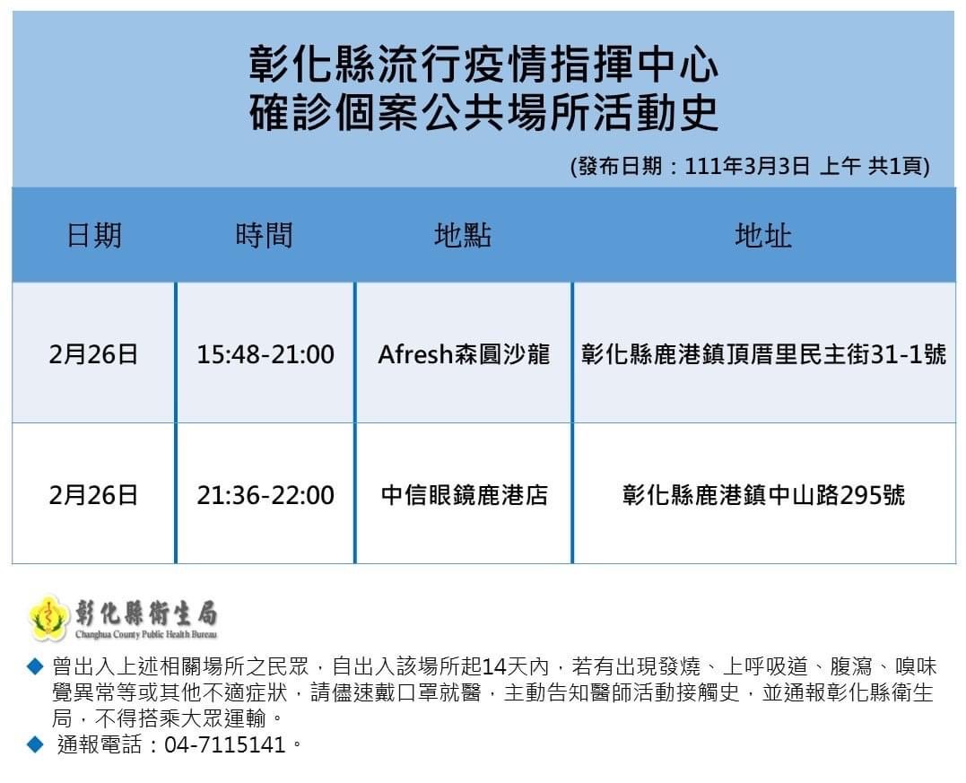 衛生局除了匡列、採檢、隔離指標個案外公家族,由於桃園指標個案的父母回到鹿港家鄉後,曾到美髮院和眼鏡行,密閉空間加上時間長,美髮院相關人士全部匡列採檢隔離,桃園指標個案父親也曾去眼鏡行,時間雖短仍進行採檢,2日下午,指標個案的媽媽與大表哥、二表哥也在隔離期間陸續確診。