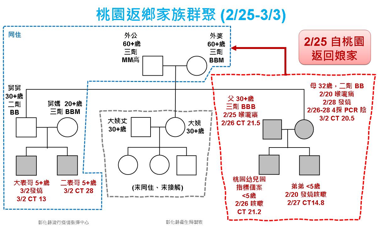 桃園幼稚園染疫事件延燒到彰化,桃園一家四口,2月25日從桃園回彰化娘家,26日到桃園採檢發現確診,通報彰化縣衛生局,彰化外婆家和舅舅、舅媽和兩個5歲和10歲小姪子都進行隔離,3月2日兩幼童確診。