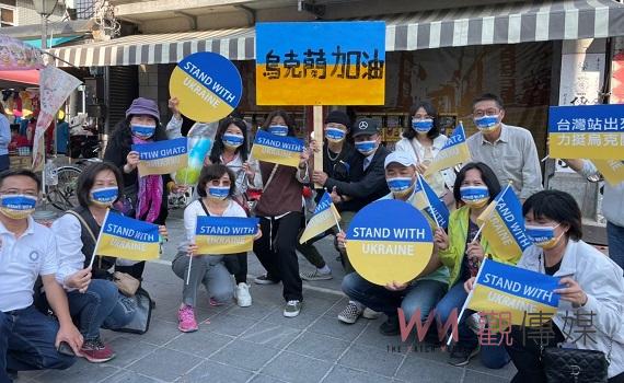 遊行隊伍沿途分送印有Stand with Ukraine(支持烏克蘭)字樣的口罩,參與者紛紛高舉準備的標語和國旗,高喊著「力挺烏克蘭」、「反對戰爭」、「普丁滾蛋」等口號,向大眾呼籲台灣與烏克蘭站在一起。