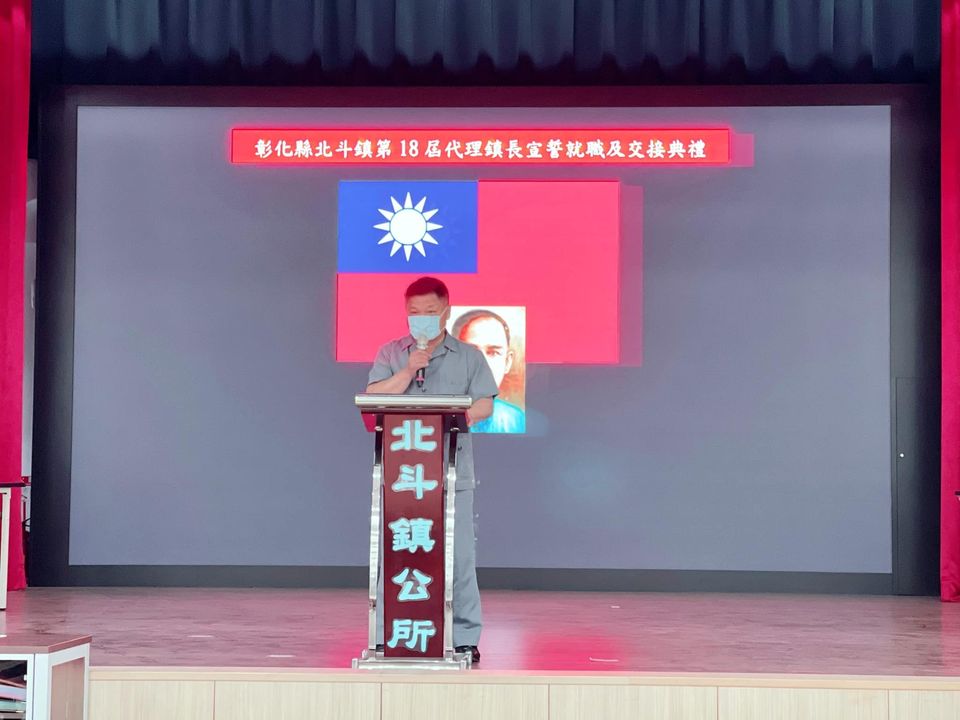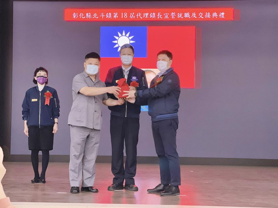 ▲北斗鎮長李玄在遭二審判決有罪遭停職,鎮長職務由彰化縣民政處副處長邱錦模代理,李玄在出席交接儀式。