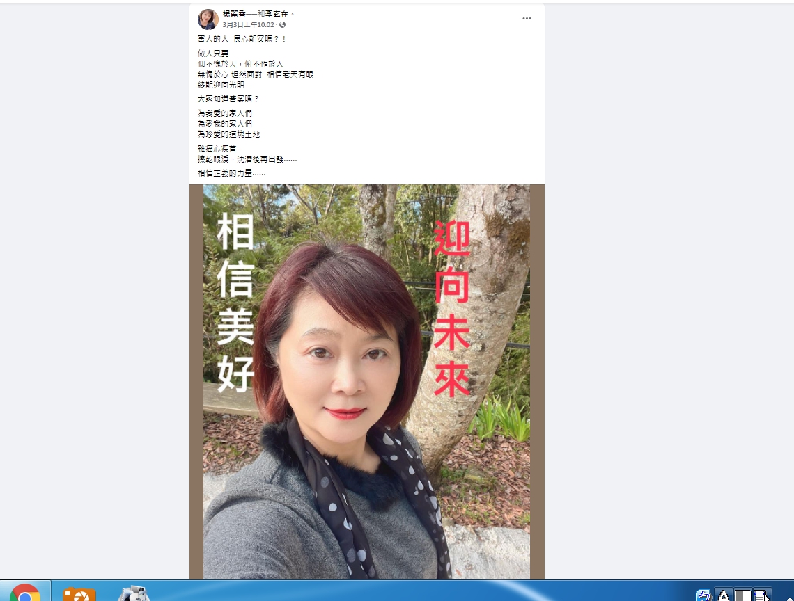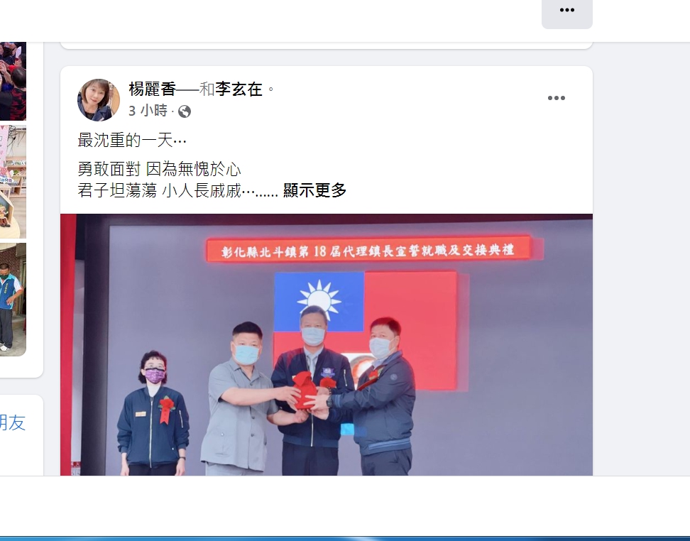 ▲李玄在之妻、前鎮長楊麗香也在臉書寫下最沈重的一天,勇敢面對,因為無愧於心君子坦蕩蕩 小人長戚戚!」。