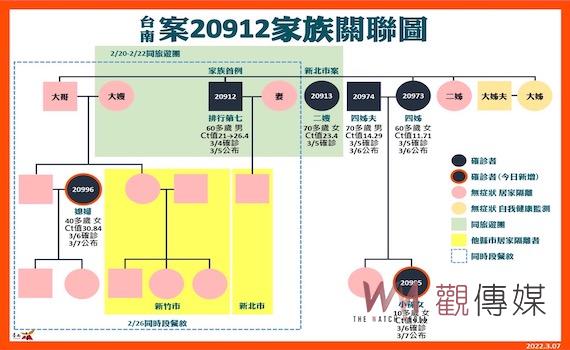 案20996則是台南市3月5日公布之案20912的親友,2月27日出現咳嗽、喉嚨有痰症狀,3月5日因案20912確診被匡列為居家隔離對象,3月6日安排採檢陽性確診,Ct值30.84。
