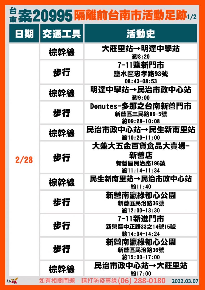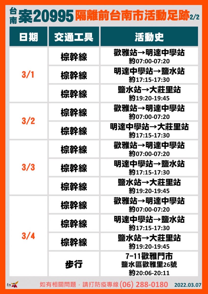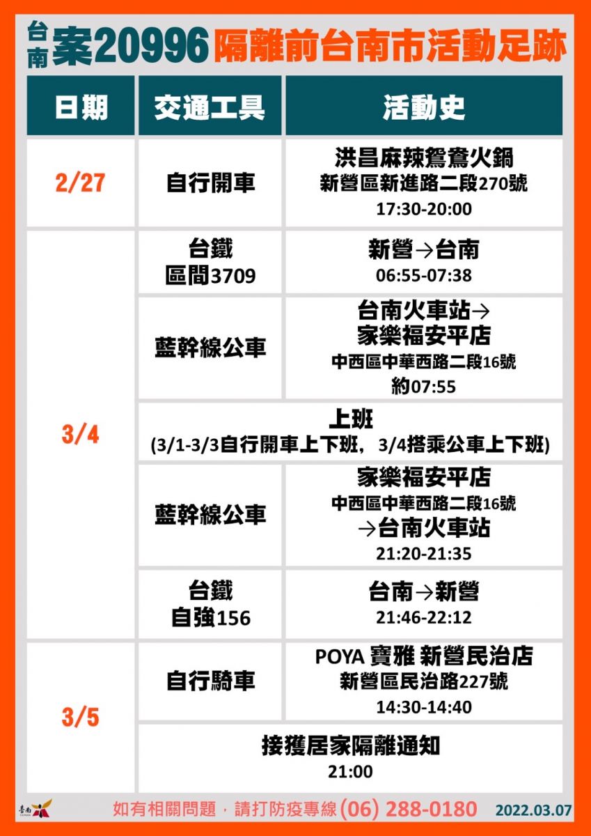 案20996於台南市活動範圍,包含洪昌麻辣鴛鴦火鍋、寶雅新營民治店;曾於3月4日搭乘台鐵及藍幹線公車,共匡列76位相關接觸者。