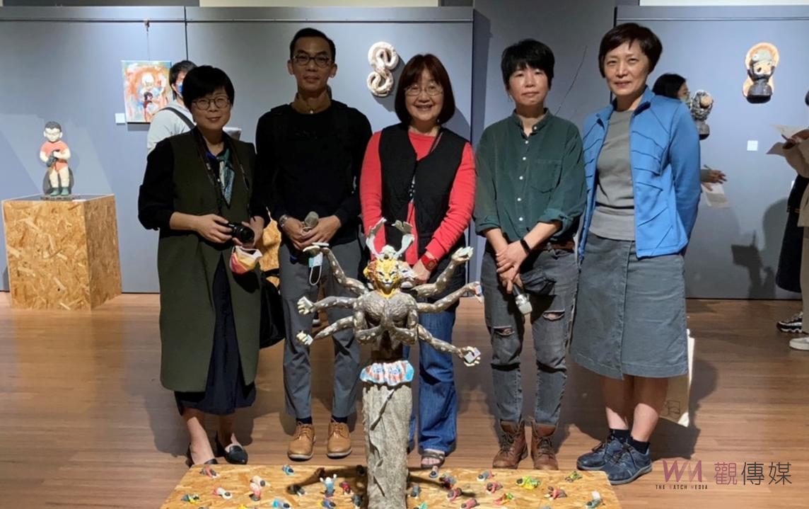 ▲藝術家戴澤羽賢伉儷(左起)、主任王文瑛、藝術家蔣嘉惠、虎科大通識教師詹彩芸預祝展覽成功。