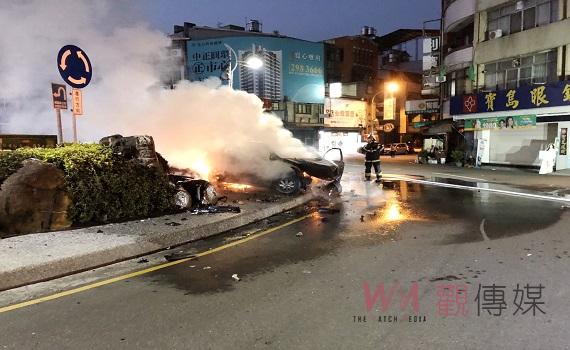 (南投新聞)【記者石振賢/南投報導】13日凌晨5時22分許,南投縣埔里鎮仁愛路圓環發生一起火燒車意外事故,經查為一名82年次的蕭姓男子酒後駕駛小客車自撞圓環護欄引發車輛起火事故。經了解該男子為外地人下榻埔里鎮上民宿,因至友人家中飲酒後返回民宿途中不勝酒力導致車輛撞擊圓環後火燒車,本起事故所幸由路過民眾及時發現救援,將渠拖出車外,避免了一場後果可能更嚴重的死傷事故,男子經送醫救護診斷後右腳骨折。員警對蕭姓男子施以呼氣酒精測試達0.64毫克,全案俟出院偵訊後以公共危險罪嫌移送南投地檢署偵辦。