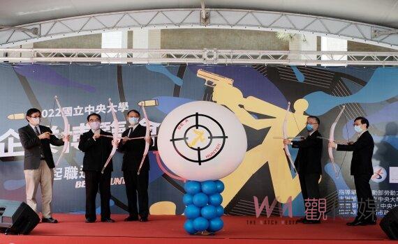 (桃園新聞) 【記者潘明賜/桃園報導】「急起職追 Be A Hunter -國立中央大學企業博覽會」,今(20)日在中大教研大樓廣場熱鬧登場,嘉賓雲集。有台積電、台達電等百家企業進駐徵才,數十種的產業類型,提供不同領域、興趣的同學最多元的就業機會。校長周景揚和副校長綦振瀛等貴賓,共同主持企業博覽會開幕儀式,射出弓箭,期許同學在職場上都能勇往直前,像獵人般擊中自己的目標。