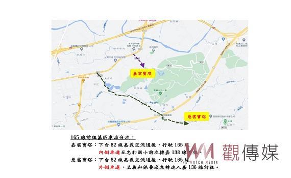 警方表示,為避免台82線嘉義交流道及165線因掃墓車潮致生壅塞,警方建議由台82線東行掃墓車流提前於中和交流道下匝道,依引導牌面續行中義路(嘉175線)、168線接165線前往墓區。由台82線西行前往嘉雲寶塔車輛,下嘉義交流道後,請行駛165線內側車道至忠和國小前左轉嘉138線;前往慈雲寶塔車輛,請行駛165線外側車道,至義和保養廠左轉進入嘉136線,以避免車流交織影響165線交通順暢。