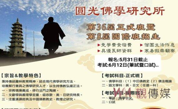 考試日期:6月12日(日)筆試與口試;考試科目:正式班:佛學科目:中印佛教史、佛法概論;語文學科:英文或日文任選一科。國際班:筆試:佛學中文;口試。5月15日上午9時至11時,辦理認識圓光研究所活動。