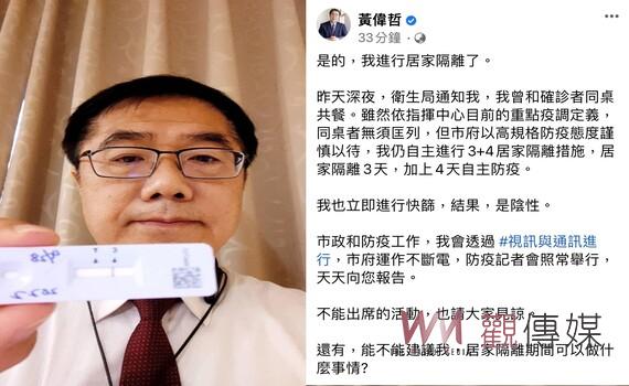 台南市衛生局指出,台南市1名確診者28日PCR報告陽性確診,衛生局人員隨即展開疫調作業,發現黃偉哲4月27日晚間曾與該名確診者同桌用餐,為確保市政運作,黃偉哲自28日晚間10時30分起開始進行居家隔離,預計隔離至4月30日結束;黃偉哲快篩結果為陰性。