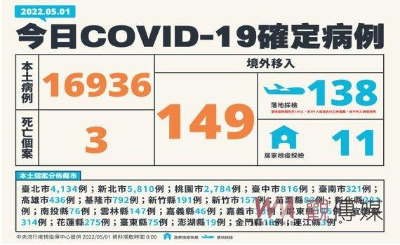(台北新聞)【記者潘明賜/台北報導】中央流行疫情指揮中心今(1)日公布,國內新增17,085例COVID-19確診,分別為16,936例本土個案及149例境外移入;新增47例中重症以上個案,其中3例死亡,1例為死後確診,均有慢性病史。