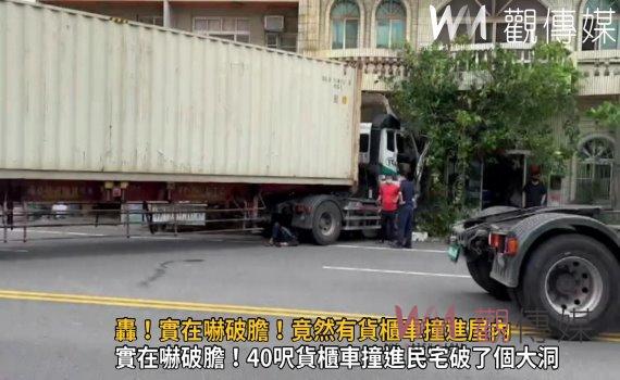 ▲鹿港鎮鹿草路一輛40呎貨櫃車撞進民宅,車頭撞擊力道大將民宅撞破一個大洞,駕駛說,為了閃避機車才會整個車頭往旁移動撞進民宅。