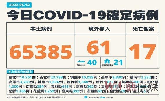 指揮中心表示,12日新增之65,385例本土病例,為31,102例男性、34,146例女性、137例調查中,年齡介於未滿5歲至90歲以上。