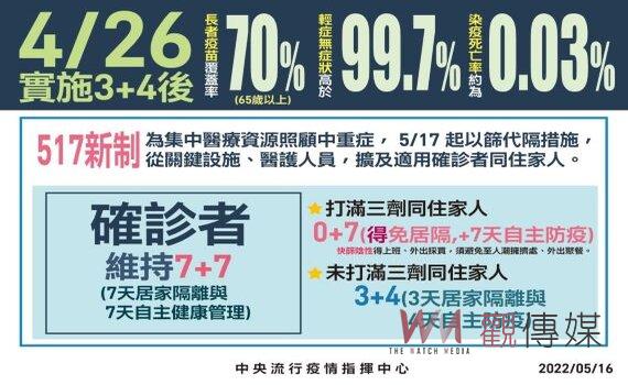 (台北新聞)【記者潘明賜/台北報導】中央流行疫情指揮中心今(16)日宣布,為因應社區廣泛流行,兼顧風險管控及維持公衛防疫量能,並參考國外防疫政策,明日起調整 COVID-19確診個案同住家人密切接觸者居家隔離政策,針對完成3劑疫苗接種者,免除居家隔離,改為進行7天自主防疫。