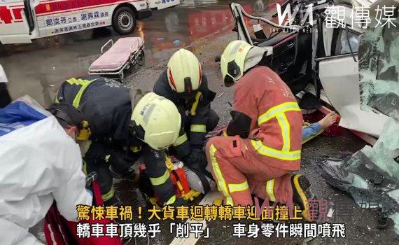 影/驚悚車禍!大貨車迴轉轎車迎面撞上 轎車車身扭曲成廢鐵駕駛傷重不治