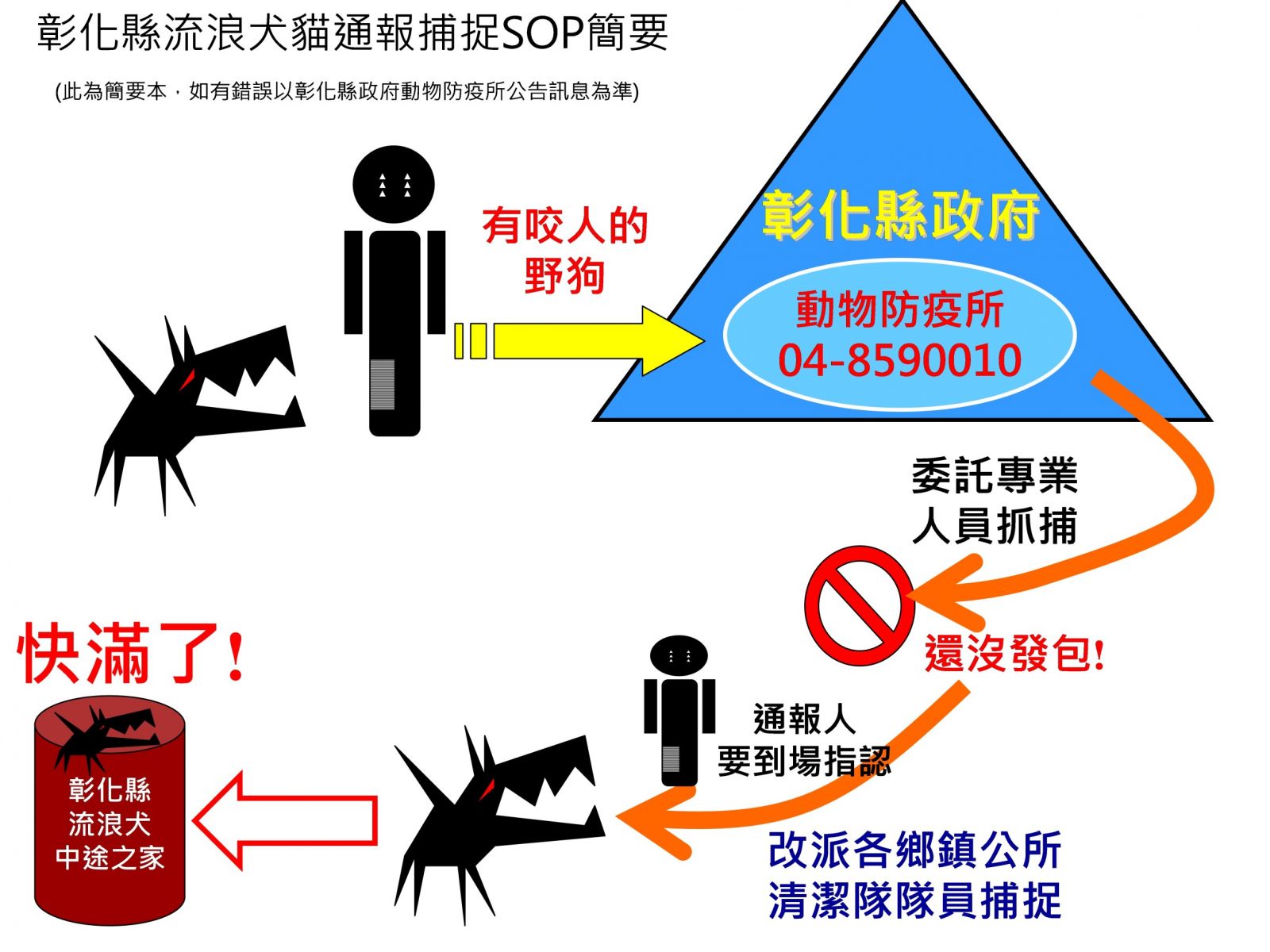 ▲民眾發現流浪狗攻擊或影響到民眾時可以撥打彰縣設置之捕犬通報專線電話(04-8590010)通報。再由動物防疫所轉請各鄉鎮市公所清潔隊捕捉。