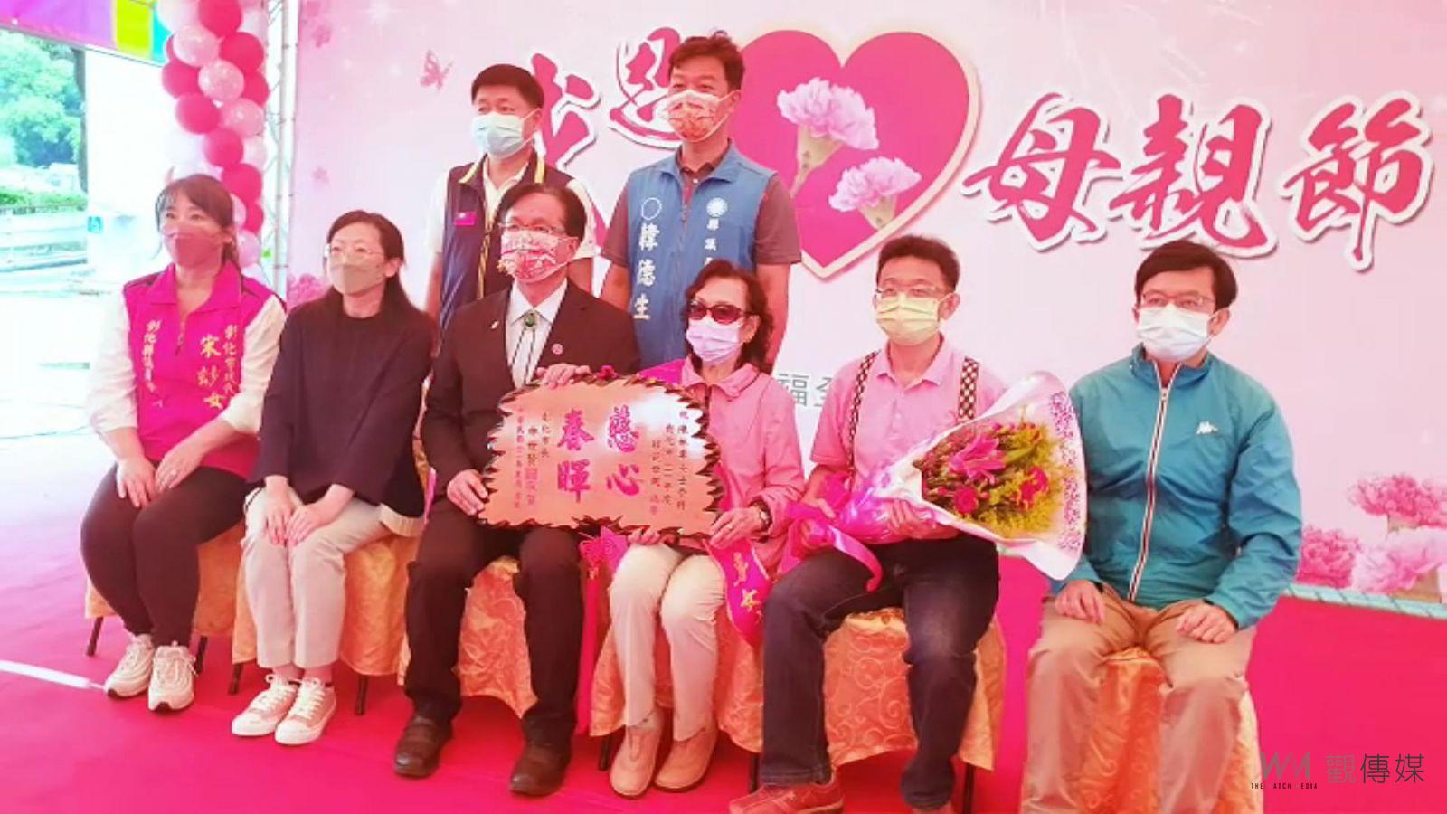 ▲彰化市公所首度移往彰化藝術館廣場戶外舉辦111年表揚模範母親大會,市長林世賢頒贈寫有「慈心春暉」給受獎媽媽,盛讚她們都是典範。