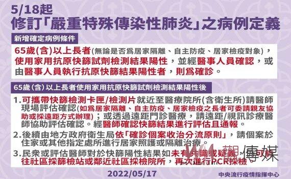 (台北新聞)【記者潘明賜/台北報導】中央流行疫情指揮中心今(17)日表示,COVID-19本土疫情持續升溫,65歲(含)以上長者,無論是否為居家隔離/檢疫或自主防疫對象,如使用家用抗原快篩試劑檢測結果陽性,並經醫事人員確認,或由醫事人員執行抗原快篩結果陽性者,即為確診,自明日起實施。