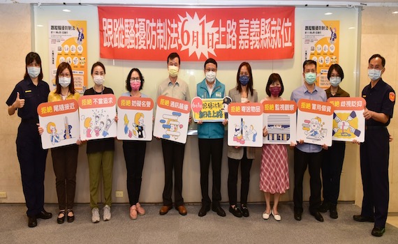嘉義縣警局也特別邀請嘉義地檢署蔡英俊主任檢察官、嘉義縣社會局、衛生局、教育處、勞青處及校外會等網絡單位及轄內警政署所屬機關,組成「嘉義縣跟蹤騷擾防制緊急應變小組」,並在今年5月份治安會報會議宣誓:「防制、拒絕跟騷,嘉義縣就位!」,協助員警在處理本類案件有任何疑義、高危機或緊急個案時,能迅速縱向及橫向協調聯繫,透過警察機關即時介入保全證據,輔以書面告誡及保護令核發讓行為人知所警惕,並透過網絡協力即時啟動聯防機制,積極展現政府保護民眾安全的決心。