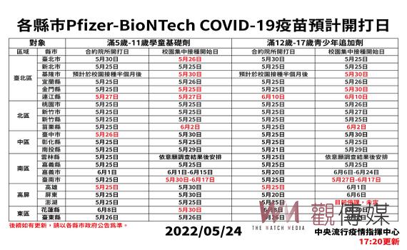 目前各地方政府校園集中接種作業,預定明日起至6月1日陸續開打,也安排/指定合約醫療院所提供接種服務,未於校園接種或滿5歲未入學兒童,可至各縣市安排、指定合約醫療院所接種。