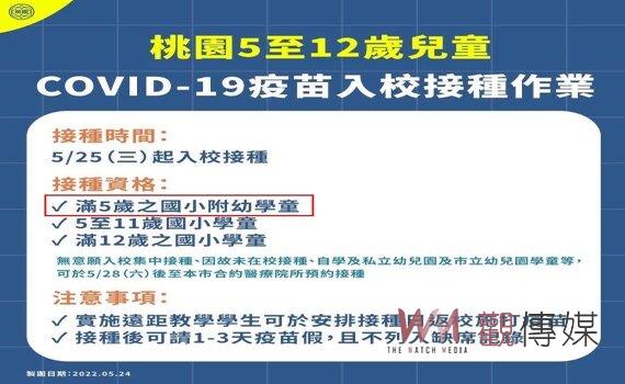 桃園市政府昨日宣布,滿5歲以上的國小附幼學童、5至11歲的國小學童、滿12歲以上的國小學童等符合資格者,都能由市府衛生局媒合醫療院所安排,入校為學童施打BNT兒童疫苗。