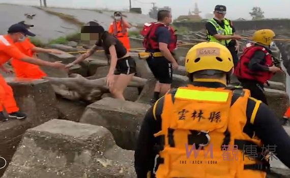 ▲四湖鄉箔仔寮漁港堤防有4名民眾因漲潮受困沙洲,海巡警消急救援。