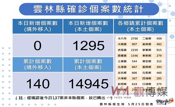 ▲雲林縣今(25)日新增本土確診1295例,中央公布新增1432例,其中137例已經轉至外縣市。
