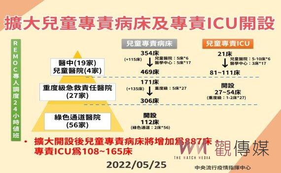 指揮中心說明,針對兒童個案醫療資源,已擴大設置56家醫院負責兒童綠色通道醫療服務、27家重度急救責任醫院協助收治中重症兒童,至於腦炎、心臟等重症兒童,將交由4家兒童醫院和19家醫學中心承擔收治,相關調度由緊急醫療網中心專人負責,醫院機構家數將視疫情狀況持續更新。