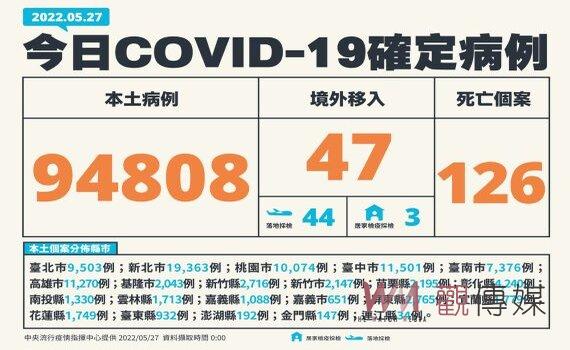 (台北新聞)【記者潘明賜/台北報導】COVID-19死亡與中重症雙雙創新高。中央流行疫情指揮中心今(27)日公布,國內新增94,855例確定病例,分別為94,808例本土個案及47例境外移入,新增126例死亡、343例中重症,其中116例重症。疫情監測組組長周志浩表示,全民快篩陽經診斷視同確診政策,上路第2天,本土個案就創下歷史新高,確診數台中、高雄超車,分列二、三名,凸顯中南部疫情已逐漸升溫。