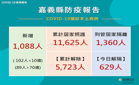 (嘉義新聞)【記者 惲 朋 /嘉義報導】嘉義縣今(27)日公布新增1088人確診,有症狀者212人,無症狀者876人。確診年齡介於10個月嬰幼兒到96歲的老年人間,其中10歲以下102人,70歲以上89人。累計全縣10歲以下幼童1345人染疫,70歲以上長者89人。目前居家隔離1360人,輕症居家照護5902人,全縣5-11歲學童計8918人接種,接種率44.33%,尚無不良反應。