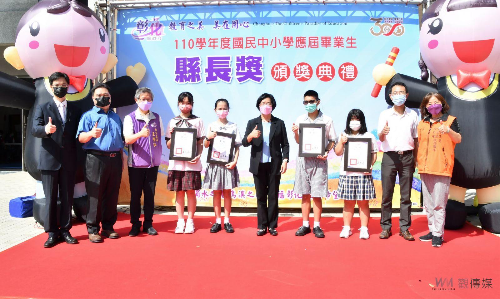 (彰化新聞)【記者陳雅芳/彰化報導】為表揚各領域優秀國中畢業生,彰化縣政府今(1)日上午在溪湖成功高中青芸館辦理110學年度國中應屆畢業生縣長獎頒獎典禮,彰化縣長王惠美表揚577位獲獎同學。這次獲獎同學中包含全國語文競賽霸主,更有克服天生障礙逆境奮發的資優生,跳得最高舉起最重的體育健兒。並期望透過表揚活動肯定學生積極進取的精神,並鼓勵學生敦品勵學。