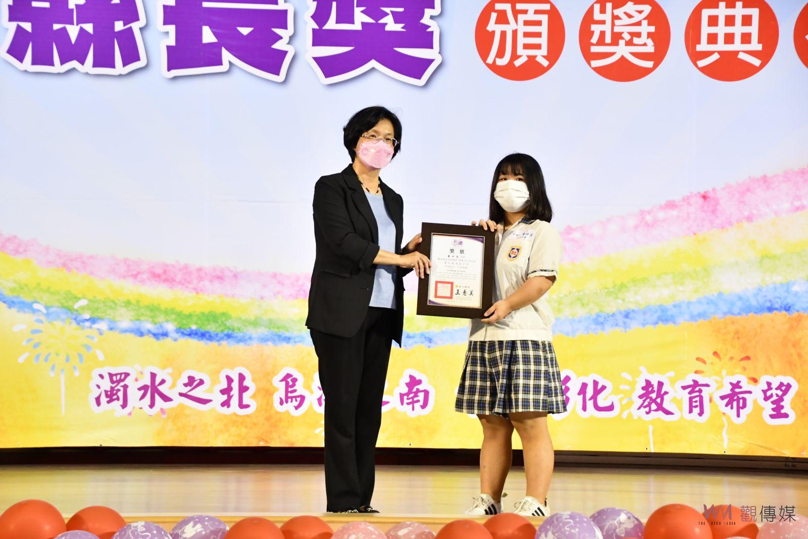 福興國中黃湘芸同學,也榮獲文學創作獎,獲得全國閩南語情境式演說特優;明倫國中劉瀚云同學,榮獲人文藝術獎,參加109年全國語文競賽,勇奪國中學生組寫字特優及參加110學年度全國學生美術比賽,榮獲書法類國中美術班組優等。社頭國中蕭梓菱同學,榮獲體育競優獎,在全中運國女59公斤舉重比賽打破大會紀錄,在在顯示彰化學生在多面向發展都很優秀。