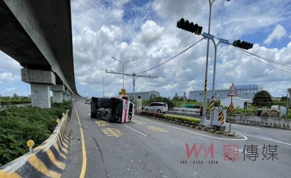 ▲救護車遭撞翻覆,2車4人受輕傷。