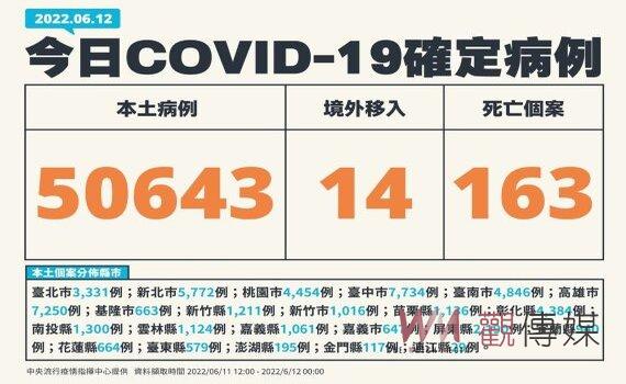 (台北新聞)【記者潘明賜/台北報導】中央流行疫情指揮中心今(12)日公布,國內新增50,657例COVID-19確定病例,分別為50,643例本土個案及14例境外移入,新增163例死亡、中重症426例,大多數為逾70歲長者,含重症147例。發言人莊人祥表示,在死亡個案中,151例罹患癌症等重大疾病或有慢性病史、110例未打滿3劑疫苗、8成2逾80歲。