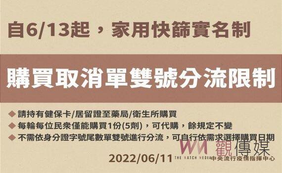 (台北新聞)【記者潘明賜/台北報導】中央流行疫情指揮中心今(11)日表示,13日起家用抗原快篩試劑實名制購買取消單雙號的限制,不需依身分證字號尾數單雙號進行分流,民眾可自行依需求選擇購買日期,提升購買之方便性。