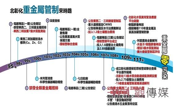 為強化北彰化水體重金屬監管制度,除訂定加嚴重金屬排放標準、公告水污染管制區及廢水排放總量管制方式外,已累計建置16座全自動水質監測站,利用大數據分析達到事半功倍之管理成效,再搭配水盒子針對可疑污染熱點加強監管,有效取締多家不法事業。總體成果反映在水質監測數據上。