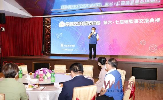 (南投新聞)【記者石振賢/南投報導】南投縣民宿觀光協會13日在南投市南島餐廳,舉行「第六、七屆理監事交接典禮」,理事長由金台灣山莊林雪華接任。縣長林明溱特別出席監交印信,除了頒發證書給新任理事長、理監事團隊,也感謝卸任理事長魏振宇對南投觀光的付出,期許新任林理事長與縣府合作,再創觀光產業巔峰。