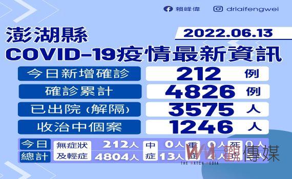 (澎湖新聞)【記者張致和/ 澎湖報導】澎湖縣政府13日公布新增212起確診案件(第4615-4826例),其中26例為學生,含澎科大8例、馬高3例、澎水1例、國中小(含幼兒園、托嬰中心)14例。