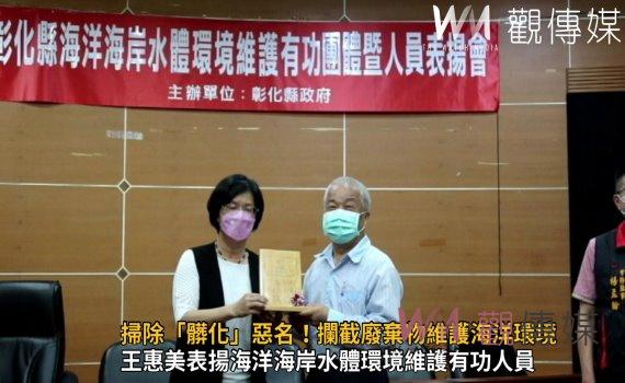 彰化縣長王惠美今(20)日表揚長期認養、淨灘團體與個人,她說,彰化海岸線長,縣內許多社區加入河川巡守隊也一起淨灘,每年約有1100多場,漁會支持下,彰化的蚵農與漁民也成立環保艦隊,共有247艘漁船協助帶回海上垃圾,再由海巡署在漁港協助秤重及記錄海洋廢棄物的重量。