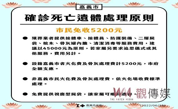 嘉義市政府表示,新冠肺炎確診亡者在嘉義市火化場處理喪葬事宜,設籍嘉義市者,家屬原應負擔火化費4000元、骨灰處理費1200元,嘉義市政府為減輕染疫亡者家屬負擔決定全數免收。至於非嘉義市籍的亡者火化費及骨灰處理費,仍依火化場收費標準收費。嘉義市政府再次指出,免收火化費及骨灰處理費總計5200元,將追溯已往生染疫並火化者,嘉義市政府將處理後續退費作業。