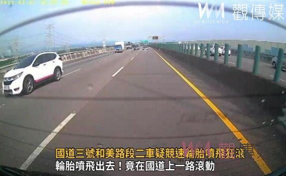 警方調查,國道三號彰化和美路段1日發生一起嚴重車禍,一休旅車與一輛轎車疑似在國道上競速並不時變換車道,不料轎車突然失控撞內側護欄再打轉到外側路肩,車上左前輪胎噴飛出去,竟在國道上一路滾動,一輛大貨車駕駛見狀還趕緊開在輪胎後方「愛心護胎」,避免後方車輛追撞釀禍。