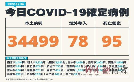 (台北新聞)【記者潘明賜/台北報導】中央流行疫情指揮中心今(6)日公布,國內新增34,577例COVID-19確定病例,分別為34,499例本土個案及78例境外移入,新增95例死亡(含1例1歲男童)、中重症275例,含重症99例。重症個案中有3例MIS-C(孩童多系統炎症徵候群),0歲女童、2歲男童與12歲女童各1例,均住院中。