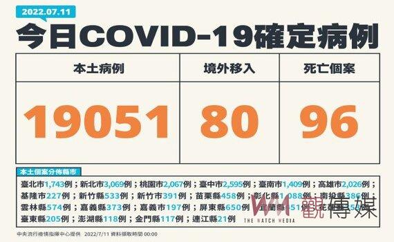 (台北新聞)【記者潘明賜/台北報導】中央流行疫情指揮中心今(11)日公布,國內新增19,131例COVID-19確定病例,分別為19,051例本土個案及80例境外移入,新增96例死亡、中重症172例,含重症86例,以及新增2例Omicron新亞型變種病毒BA.5本土個案。