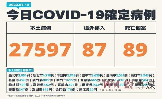 (台北新聞)【記者潘明賜/台北報導】中央流行疫情指揮中心今(14)日公布,國內新增27,684例COVID-19確定病例,分別為27,597例本土個案及87例境外移入,新增89例死亡、中重症231例,含重症73例。