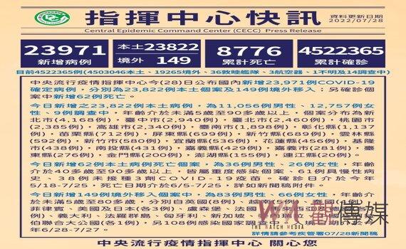 (台北新聞)【記者潘明賜/台北報導】中央流行疫情指揮中心今(28)日公布,國內新增23,971例COVID-19確定病例,分別為23,822例本土個案及149例境外移入,新增62例死亡、中重症143例,含重症55例。