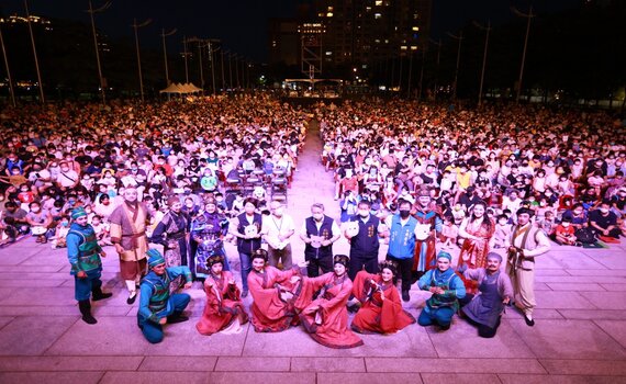 (台中新聞)【記者顏淑娟/台中報導】台中市政府文化局邀請備受大小朋友喜愛的紙風車劇團,帶來台灣漫畫英雄《諸葛四郎》。昨(6)日晚在市府前廣場演出《諸葛四郎》兒童劇。現場近超過6,000位的大朋友小朋友,與演員們一起共度父親節假期。這部改編自台灣經典漫畫英雄串起三代情的精采故事,以現代動漫造型結合古裝人物,並融合多種表演元素,高潮迭起。